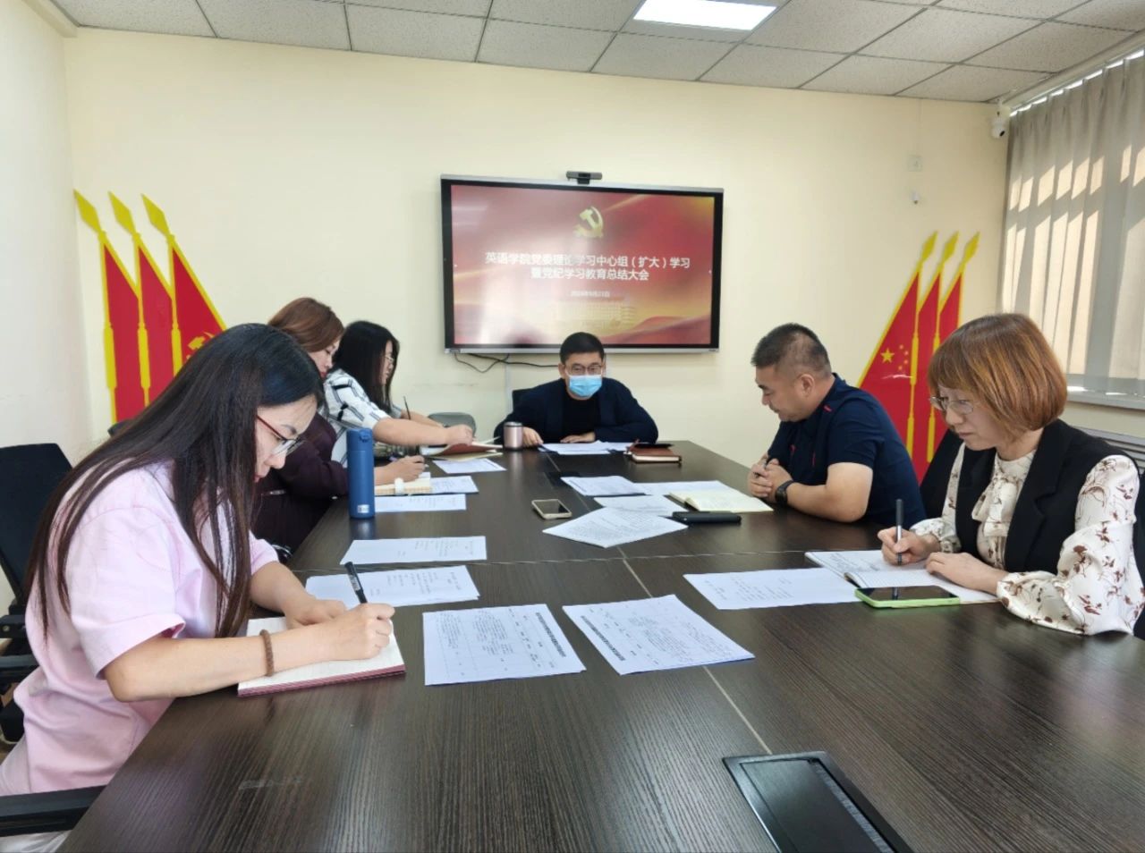 为深入梳理过去一段时期内英语学院党员干部的学习经验、分析现存问题,9月23日,英语学院党委理论学习中心组(扩大)学习暨党纪学习教育总结大会顺利召开。本次会议由英语学院党委副书记兼纪委书记孙硕主持,英语学院党委书记梁若冰、党委副书记兼院长吕春媚、副院长刘晓晖、副院长罗俏鹃、副处级组织员汪霞及党委委员兼办公室主任郭庆霞参加本次会议。