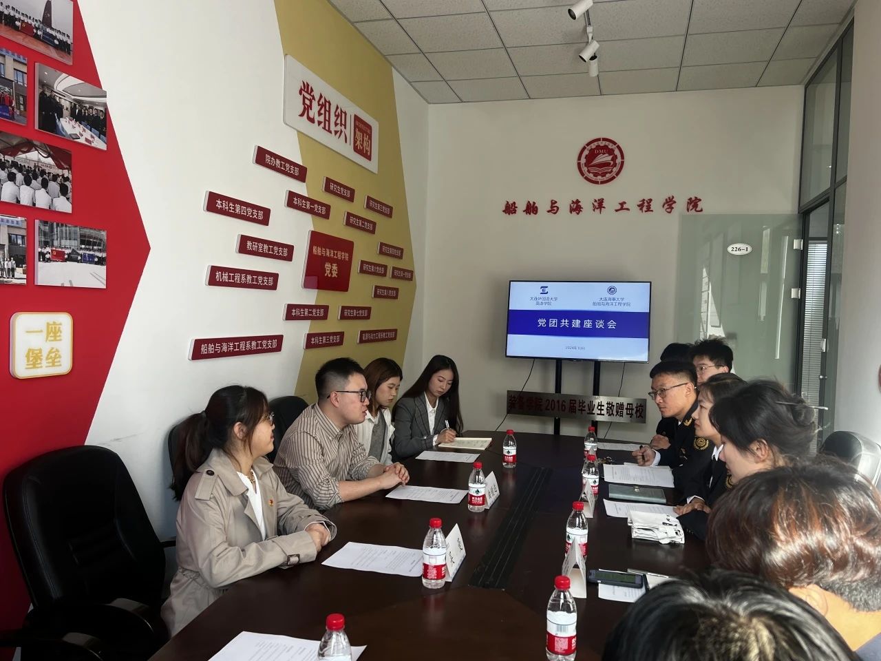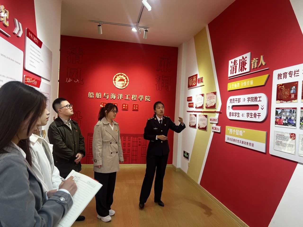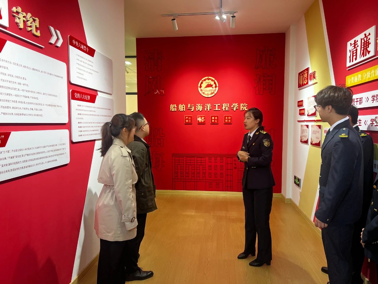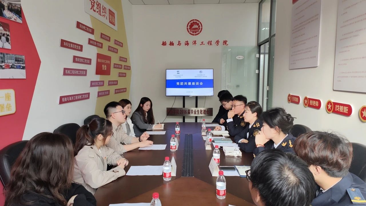 在船舶与海洋工程学院研究生学生党支部书记王宏诗、本科生第三党支部书记薛航、本科生第四党支部书记曲宸阳的热情接待下,英语学院本科生第一党支部一行参观了船舶与海洋工程学院的廉政长廊、工会空间建设等标志性场所,系统认识了船舶与海洋工程学院在党建工作方面的优秀成果。