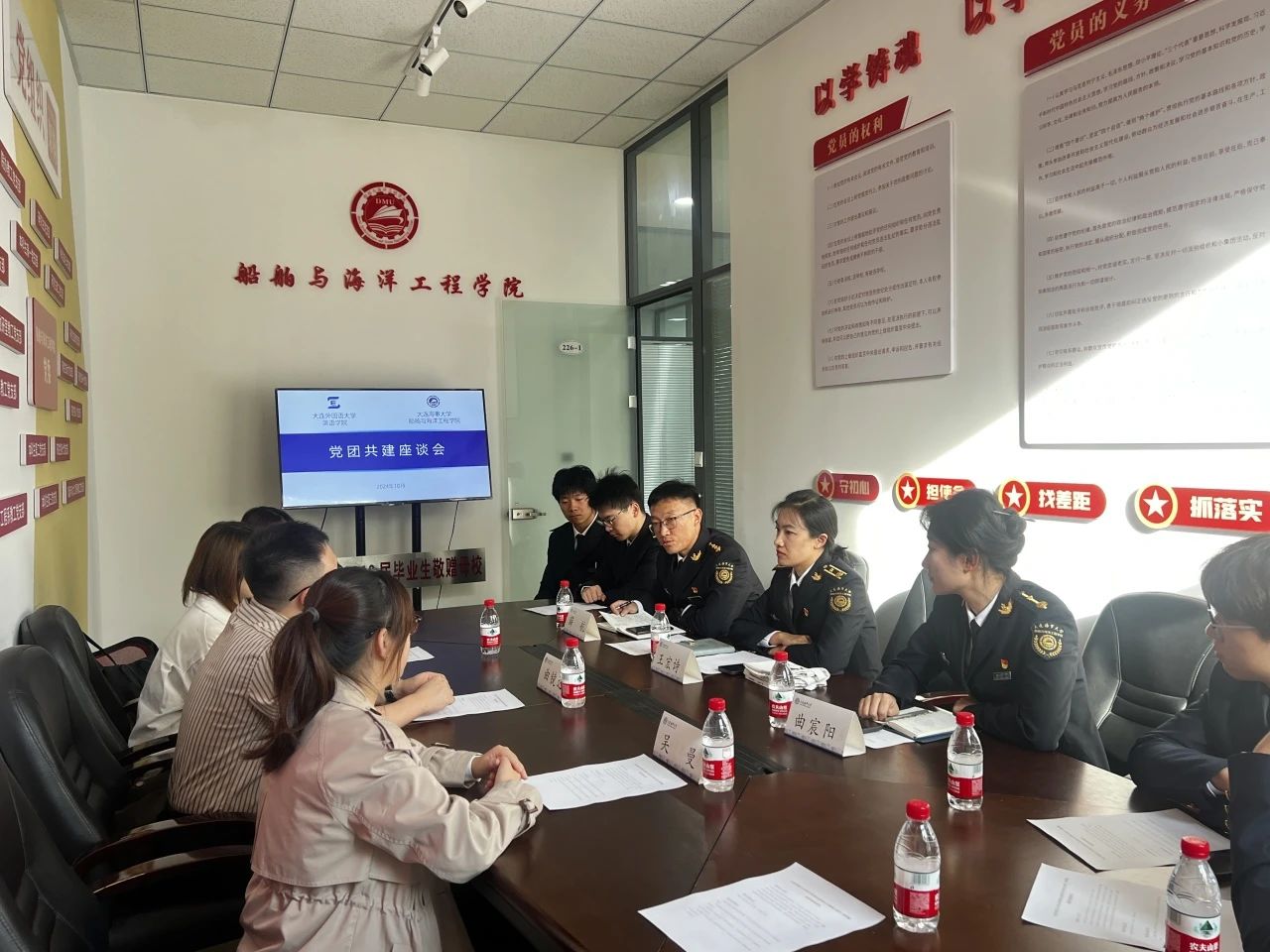 随后,双方举行了交流座谈会。双方围绕支部构建、党员的选拔与培养、特色主题党日活动开展形式以及加强合作交流等方面进行深入探讨。双方支部书记依次介绍了各自党支部的组织架构、党员培养、特色活动等内容,并就党员教育、志愿服务、社会实践等关键领域分享了各自的做法与成效,以期互相借鉴优秀样板支部党建工作经验,共同探索党建工作新路径。