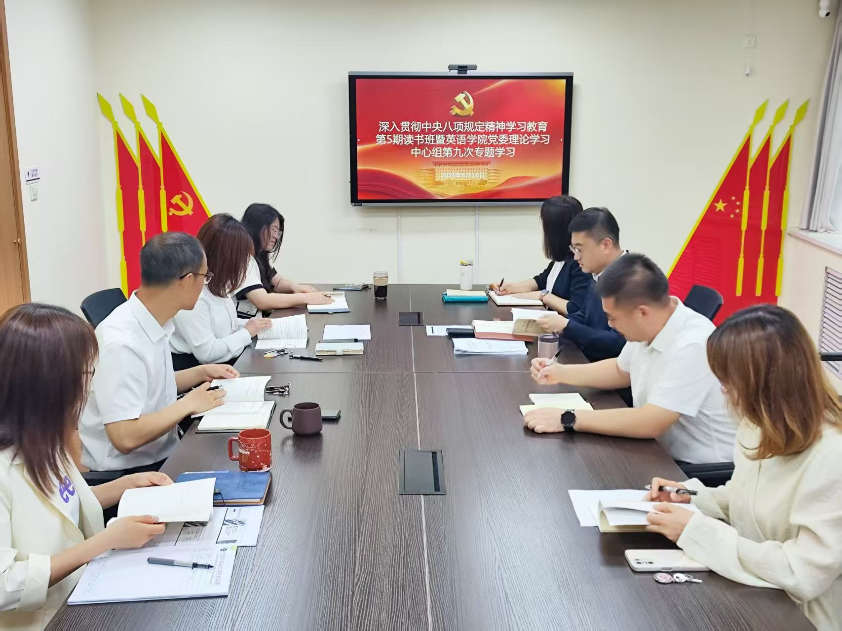 6月16日上午,英语学院党委理论学习中心组召开深入贯彻中央八项规定精神学习教育第5期读书班专题学习会议。党委理论学习中心组成员参加会议,学院党委书记梁若冰主持会议。