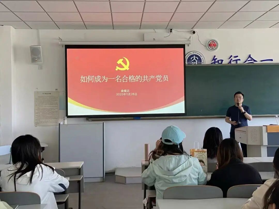 在第三讲的课堂上,英语学院本科生第一党支部书记、团委书记曲镜达为入党积极分子们带来了《如何成为一名合格的共产党员》主题课程,他强调要加强思想建设和理论学习,坚持党的指导思想,将全心全意为人民服务的宗旨牢记于心。他表示,入党积极分子必须牢记自我角色,强化党员意识,在攻坚克难中冲锋在前,用实际行动诠释“吃苦在前,享乐在后”的深刻内涵。同时,要认清重大问题,坚定理想信念,从思想根源上筑牢信仰之堤。最后,曲老师鼓励各位入党积极分子严格要求自己,争取早日成为一名合格的共产党员。