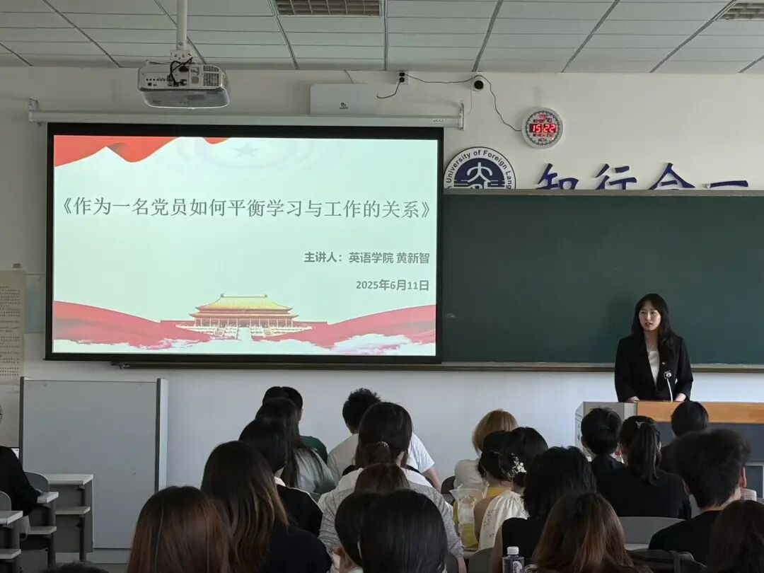 在第十讲的课堂上,英语学院研究生党支部书记黄新智为入党积极分子们带来了《作为一名党员如何平衡学习与工作之间的关系》专题课程,她向同学们剖析了党的理论指引与实践成长之间的紧密关联,助力在座入党积极分子明晰如何有效统筹理论汲取与实际行动、提升综合素养。黄新智老师指出,理论联系实际是党的优良作风,同学们要扎实开展理论学习,积极投身实践锻炼,培养务实担当精神,强化服务群众本领。最后,黄新智老师以视频形式启发入党积极分子们要善于钻研理论、勇于实践探索,不断增强知行合一能力,努力实现学用相长,践行新时代青年的责任使命。