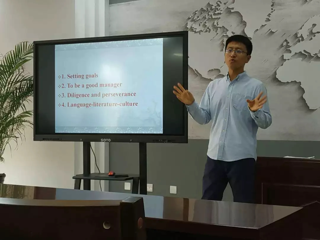 刘老师与大家分享了他对“英语世界”之感悟,并且为大家提出了四条建议。第一,确立目标。刘老师建议同学们根据兴趣爱好规划自己的未来。第二,做自己的管理者。管理好人际关系,个人情绪,等等。第三,努力学习。刘老师提醒同学们珍惜宝贵的大学时光,提升自我。第四,将语言,文学,文化相结合。刘老师认为,阅读经典英文名著,出国感受英美文化对英语专业的学生大有益处。