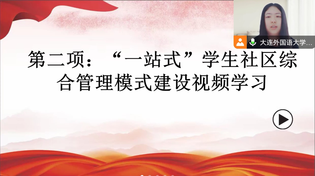大会第二项由韩秀书记带领同学们通过观看视频对“一站式”社区综合管理建设模式进行了深入学习。韩秀书记指出,英语学院“E”社区研究生功能型党支部可以借鉴现有试点高校“一站式”社区综合管理模式,从而打造贴合实际,体现英院特色,深入学生一线的学习生活园区。