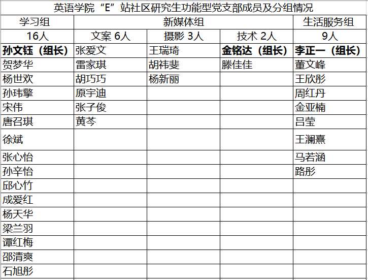 大会第三项进行了英语学院“E”站社区研究生功能性党支部调研与调研环节,这是本次会议的重中之重。支部全体成员针对支部分组、分工及未来可以开展什么样的活动进行了激烈讨论。在韩秀书记和各位党员同学的集思广益下,本支部共分为学习组共16名党员、新媒体组共11名党员(其中新媒体组又分为文案组、摄影组和技术组)和生活服务组共9名党员在内的三个小组。学习组工作性质在于组织日常学习活动,例如每周一次专四答疑活动,这是本支部需要长期坚持的工作。其次学习组可以每月一次组织一些大型活动,例如具有红色主题的配音大赛。新媒体组工作性质分为三类,文案组负责文字工作,摄影组负责每次活动或会议的摄影与图像编辑,技术组主要负责技术运营。生活服务小组工作性质在日常生活技术服务,如备用外用如棉签、创可贴等医疗基础用品为同学们应急使用、修理用品等。