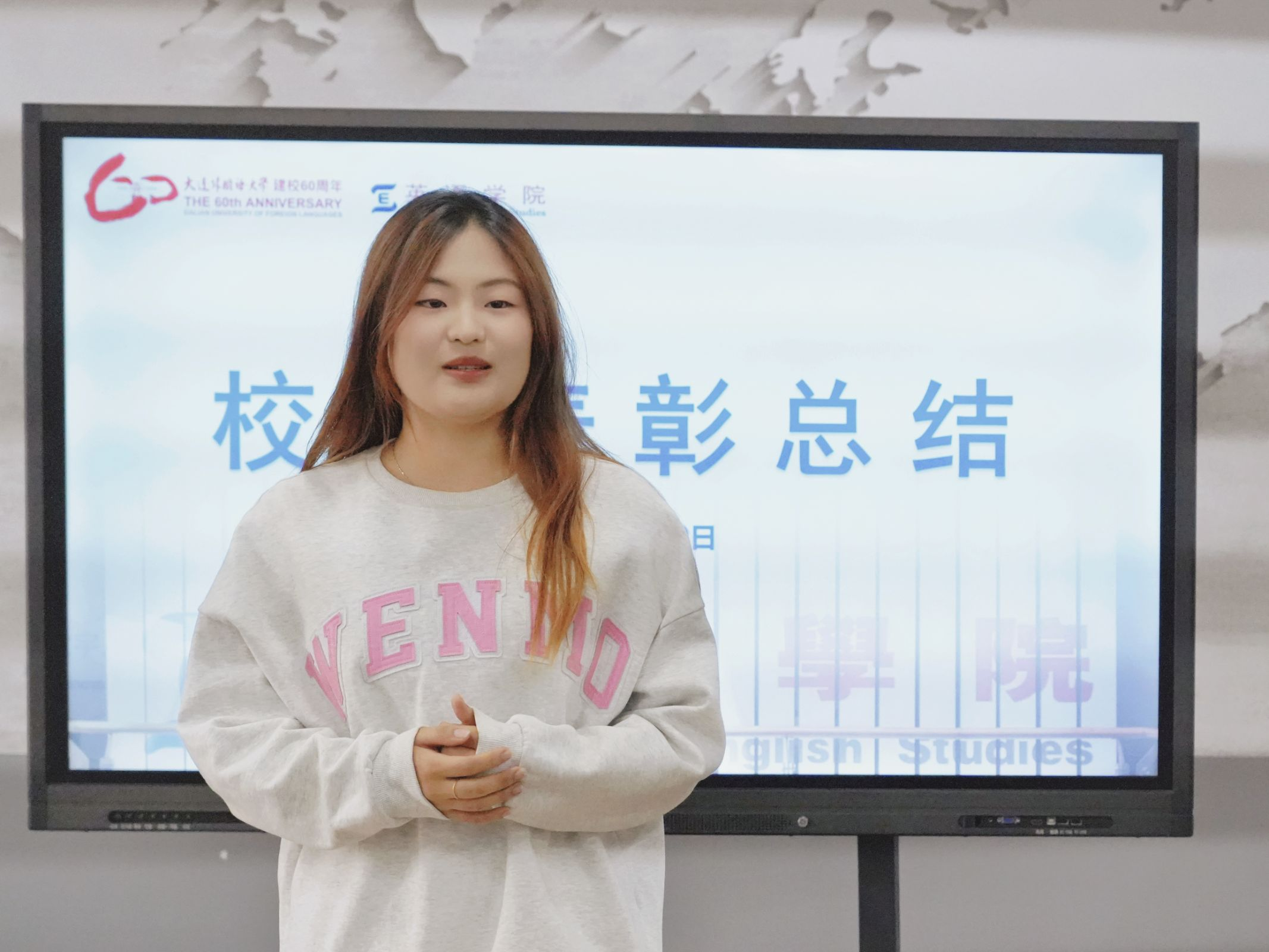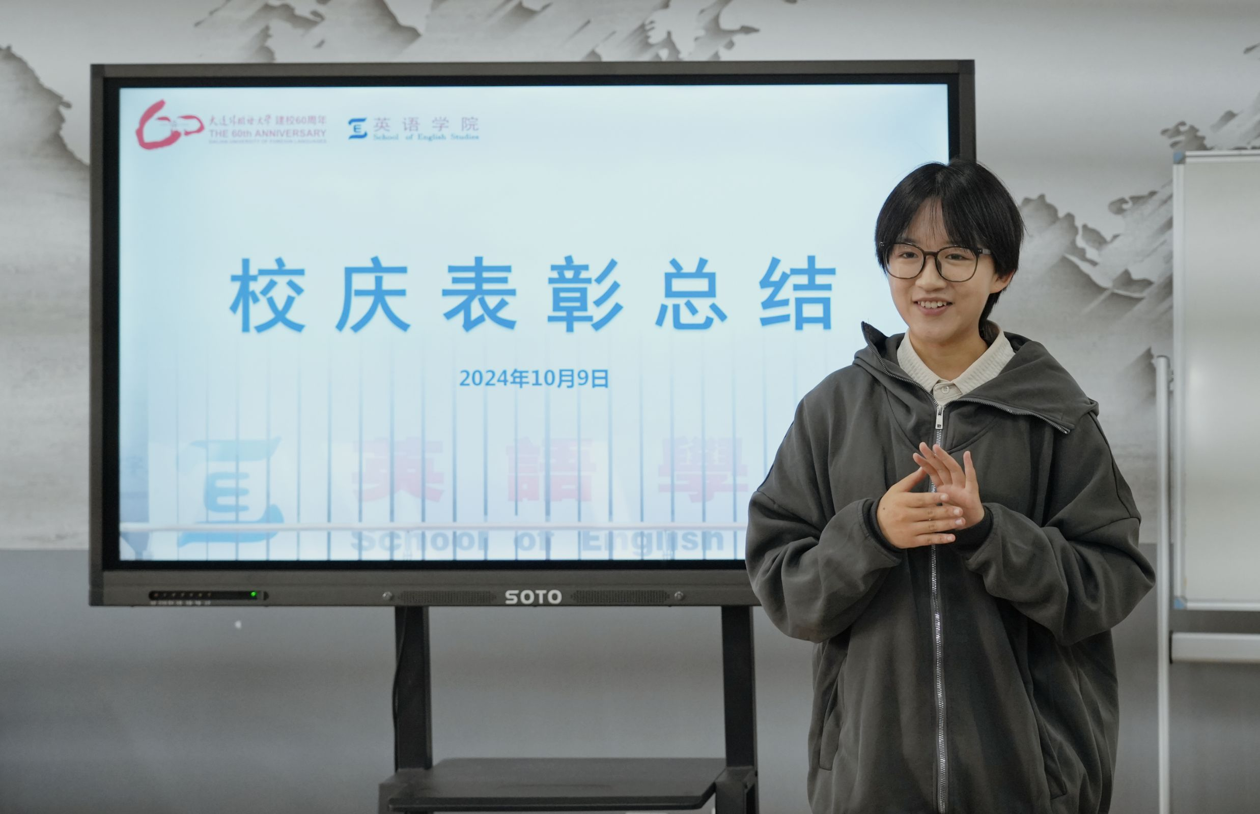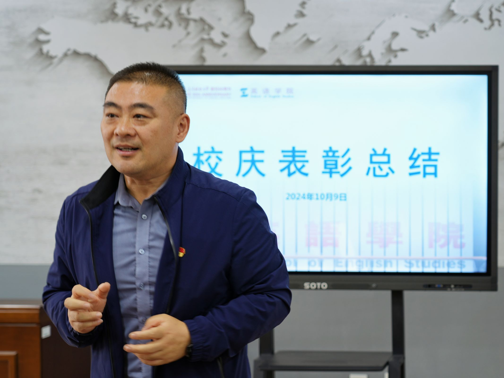 为进一步加强学院建设,总结英语学院师生在我校六十周年校庆的精彩表现,并对学院各个部门工作进行表彰,10月9日下午,英语学院在励业楼爱尔兰中心举办校庆工作总结会暨表彰大会。本次会议由英语学院党委副书记兼纪委书记孙硕主持,英语学院团委书记兼2023级辅导员曲镜达、2021级辅导员达尼亚尔江·亚力坤江、2022级辅导员李延奇、2023级辅导员吴曼、2024级辅导员王艺凝出席此次会议。