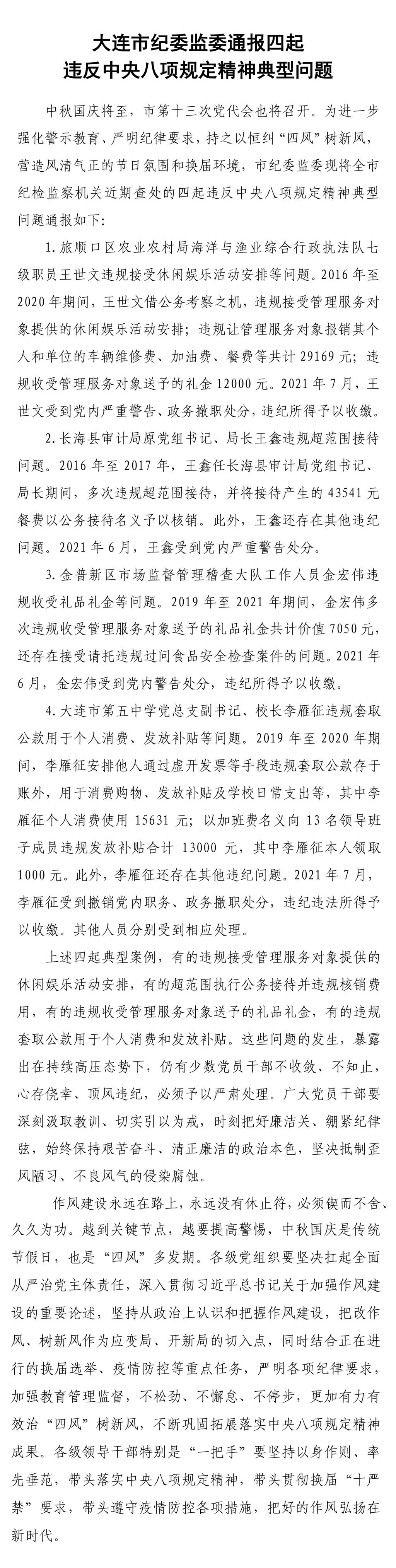以案为鉴第十期:大连市纪委监委关于四起违反中央八项规定精神典型问题的通报