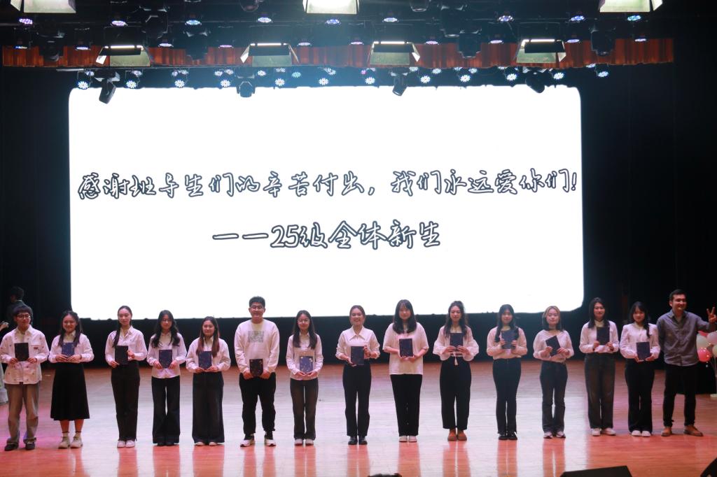 中场休息过后,第二阶段“绽放·韶华如歌”正式开始。一场歌曲串烧《飞云之下+至少还有你》将大家的情绪再次点燃,2025级新生教官和各班班导生共同参演情景剧+歌唱《赴一场遇见,忆一段时光》,相声《如此搭档》令观众捧腹大笑,舞蹈《雨涧春行图》优雅灵动,歌曲《新的心跳》动人心弦,以花为主题的《E-Show》引得在场观众阵阵掌声。随后,孙硕副书记上台,亲自为同学们抽取并揭晓了获得本届嘉年华暨2025级新生迎新晚会特等奖的同学,将展演的氛围推向又一个高潮!抽奖之后,由2025级辅导员达尼亚尔江·亚力坤江为各班班导生颁奖,表彰其为同学们的辛勤付出与一路上的温暖陪伴。